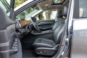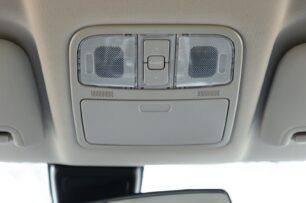 Algo más retrasados quedan dos posavasos cubiertos y un reposabrazos fijo con guantera. Esta tiene un espacio muy amplio y es refrigerada. El espacio de almacenamiento interior es bueno, aunque no destaca entre los SUV familiares de siete plazas. Sobre el techo de las plazas delanteras hay un portagafas forrado e iluminación halógena.
