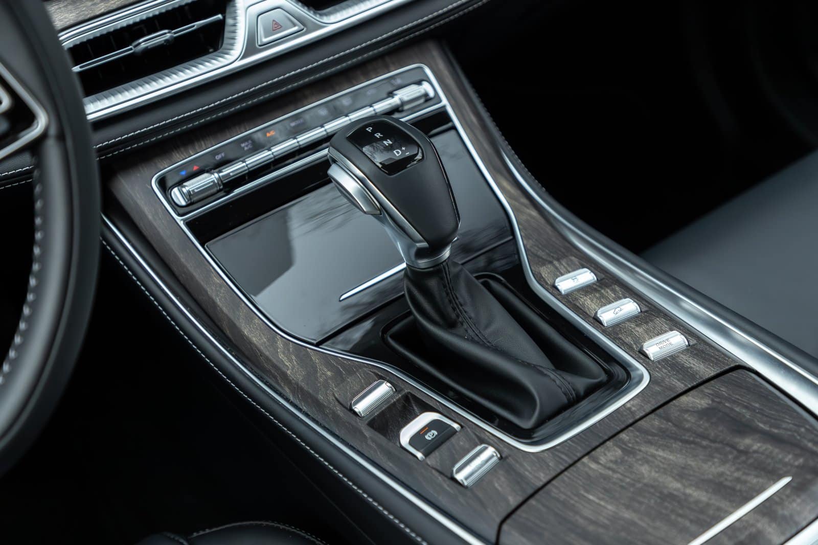 Ya en la consola central, una tapa en el tedioso negro brillante alberga un hueco portaobjetos. En ella están la toma USB convencional (no hay USB-C) y la toma de 12V. A continuación vemos la palanca del cambio y una serie de botones: selector de modos de conducción, freno de mano eléctrico, ayuda al descenso de pendientes, Auto Hold…