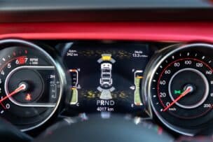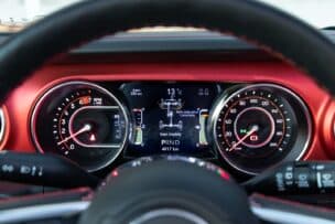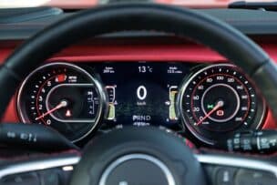 Cabe destacar que el equipo de frenos está compuesto por discos ventilados en el eje delantero (330 mm de diámetro) y discos macizos en el trasero (342 mm de diámetro). Son suficientes para frenar el Wrangler con eficacia, pero requieren cierto período de adaptación porque, dada su asistencia, a veces parece que tienen una menor potencia.