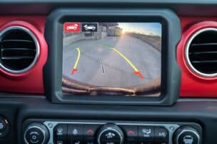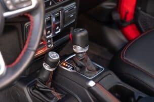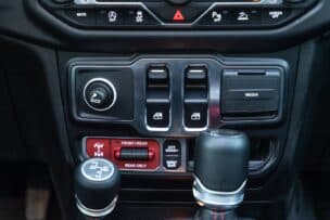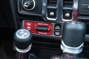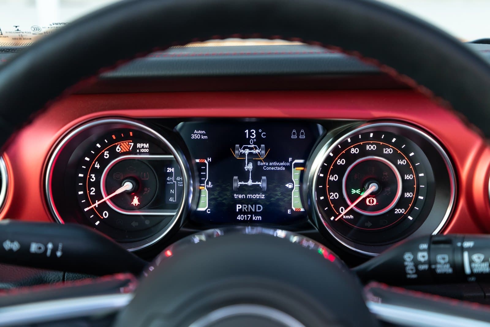 En otras palabras, en el Rubicon cada vuelta del cigüeñal del motor supone una menor velocidad de avance. Gracias a ello es posible avanzar más despacio por zonas complicadas. El Rubicon también ofrece carcasas del diferencial más gruesas, dientes del anillo y del piñón del diferencial más robustos, bloqueo de los diferenciales delantero y trasero (Tru-Lock) y desconexión de la barra estabilizadora delantera para aumentar el recorrido de las ruedas
