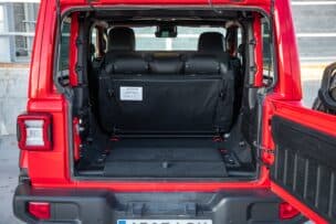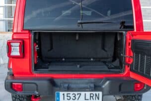 En términos de habitabilidad, el Wrangler de tres puertas ofrece buen espacio delante, pero escaso detrás. Es difícil acceder a él por la altura libre y toda una odisea meterse en la parte posterior, incluso siendo ágil. Atrás hay buena anchura y altura para dos adultos de hasta 1,90 metros, pero el espacio para las piernas no es abundante. También el maletero es pequeño.