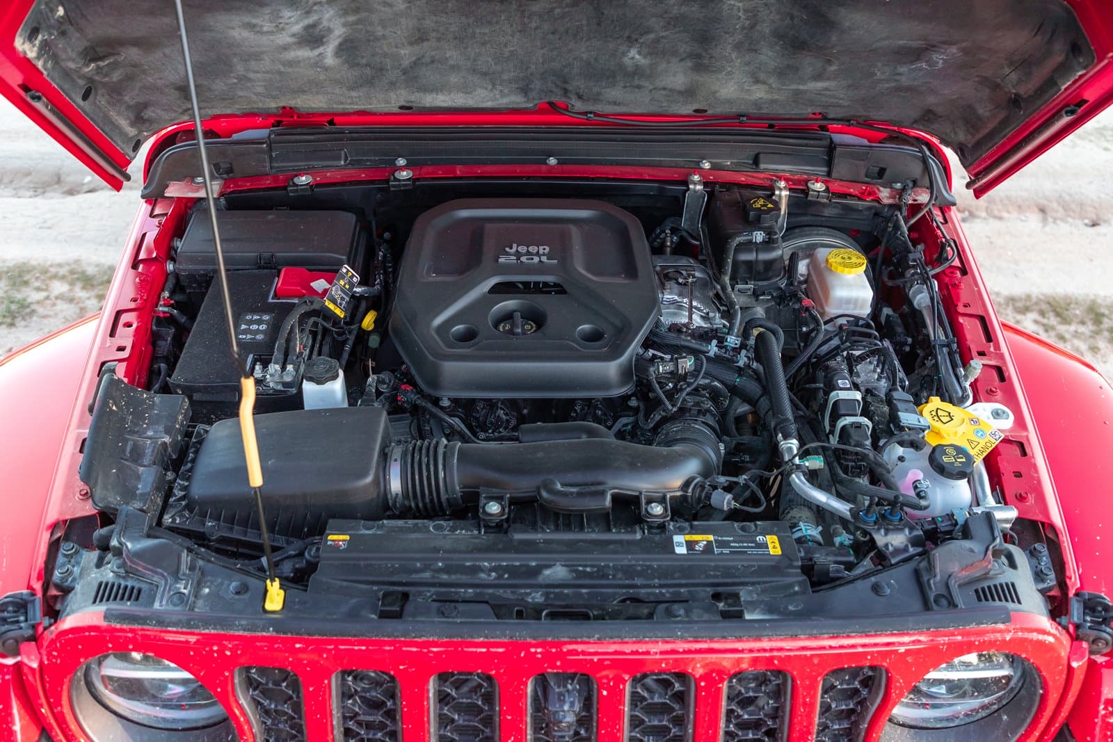 La única opción mecánica disponible para el Wrangler de tres puertas es el motor de gasolina. Se trata de un bloque de cuatro cilindros y 1.995 cm3. Fabricado en aluminio, cuenta con dos árboles de levas en la culata, inyección directa, turbo e intercooler. El Start/Stop es de serie y eroga 272 CV (200 kW) a 5.250 rpm y 400 Nm de par entre 3.000 y 4.500 rpm.
