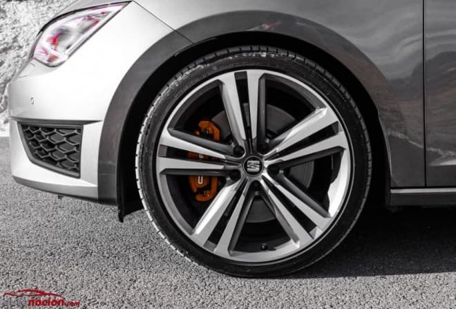Las increíbles llantas del CUPRA en diseño de 5 radios dobles en color titanio en dos tonos, montaban unos neumáticos Bridgestone Potenza en dimensiones 235/35 R19 91Y. Estos neumáticos ofrecen un excelente comportamiento en superficies secas y cálidas y la verdad es que sus prestaciones son dignas de mención. Las llantas de nuestra unidad de pruebas encerraban un sistema de frenos SEAT de serie. Este sistema de frenos está compuesto por unos discos: (340 mm delanteros ventilados y 310 mm traseros).