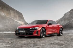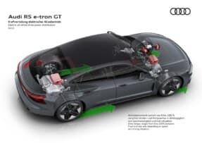 En el RS e-tron GT, el motor eléctrico del eje delantero también rinde 175 kW (238 CV), mientras que el motor trasero alcanza una potencia de 335 W (456 CV). La potencia total de sistema en este caso es de 598 CV (440 kW), y el par máximo es de 830 Nm. En modo boost, la potencia aumenta de forma momentánea hasta los 475 kW (646 CV).
