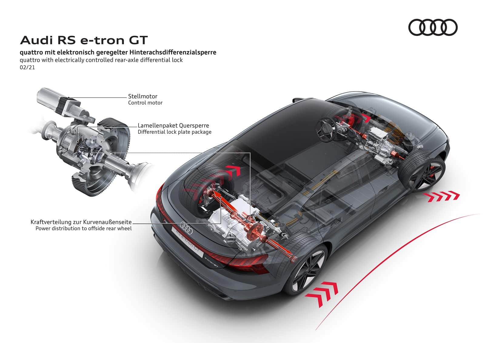 Un componente mecánico en el eje posterior complementa a la tracción integral eléctrica: el diferencial autoblocante con valores de bloqueo fijados previamente. Esto mejora la tracción y la estabilidad y reduce las reacciones a los cambios de carga. Es opcional en el e-tron GT quattro y de serie en el RS.
