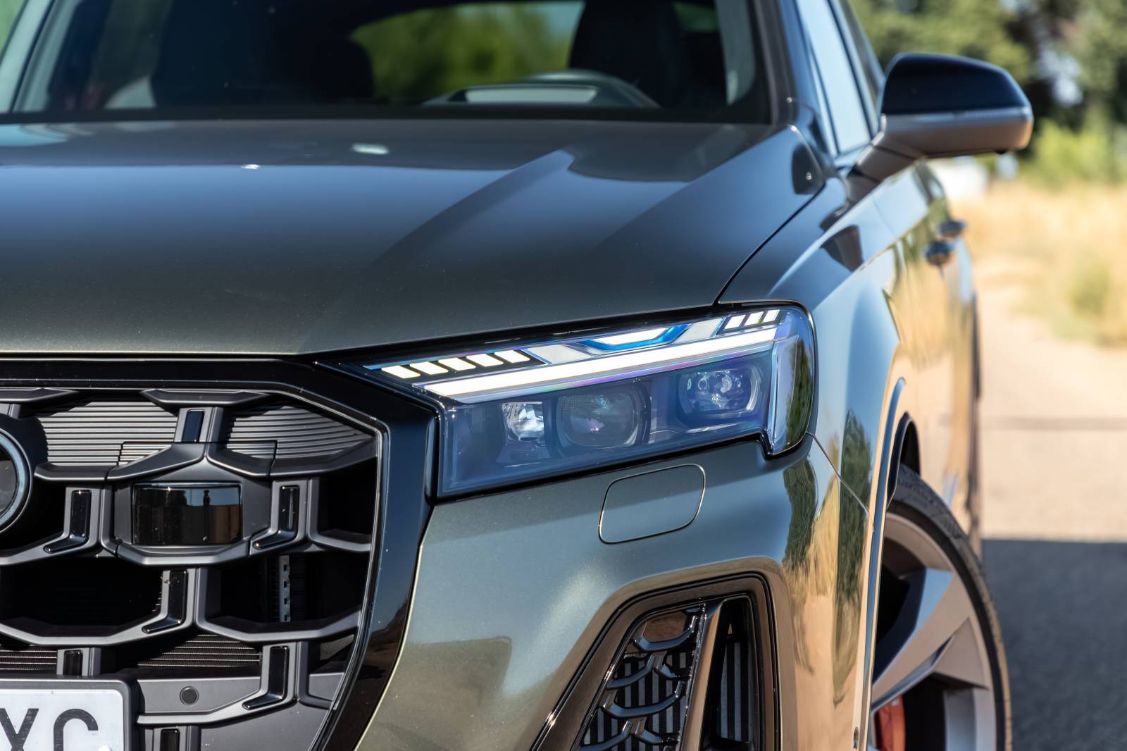 El Audi Q7 ahora luce la nueva identidad corporativa de Audi, con los aros bidimensionales que debutaron en el Q8 e-tron. En lugar de cromados, el nuevo logo está acabado en colores blanco y negro. Para la iluminación, puede equipar los faros HD Matrix LED con luz láser. Estos faros incorporan luces diurnas digitales y la posibilidad de seleccionar entre distintas firmas lumínicas.