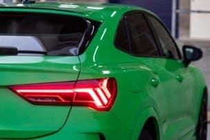 Hay disponibles un total de ocho pinturas con acabado sólido, perlado y metalizado. En este caso vemos el Verde Kyalami sólido. Los retrovisores pueden pintarse en negro brillante, aluminio o carbono; al tiempo que los aros Audi y las inscripciones también se pueden pintar en negro brillante, como es el caso de esta unidad. Hay siete diseños de llantas para elegir.