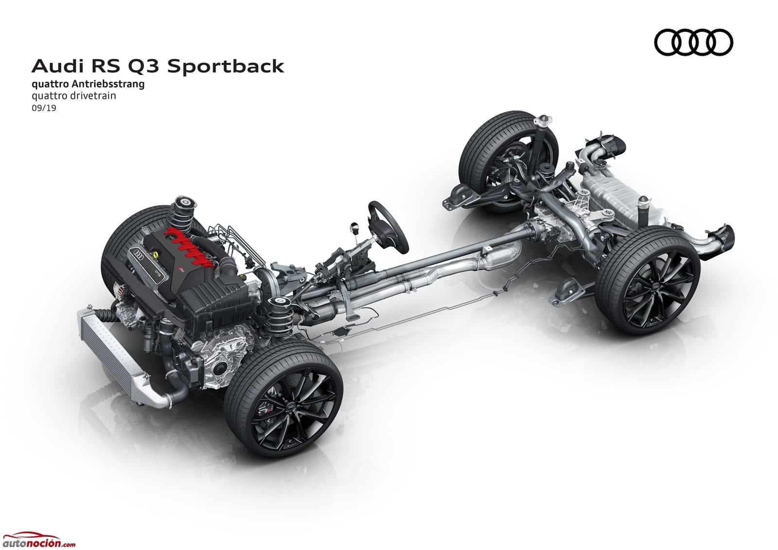 Uno de los elementos más suculentos del Audi RS Q3 Sportback es lo que esconde en sus entrañas. El corazón de la bestia es el bloque de cinco cilindros TFSI con 2.5 litros ya visto en el Audi TT RS 2019. Con una potencia específica de 161.3 CV por litro, el bloque y la culata son de aluminio, por lo que el peso total del conjunto es 26 kg menor que en el anterior RS Q3.