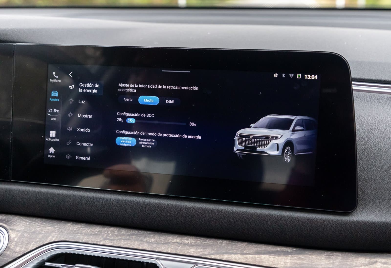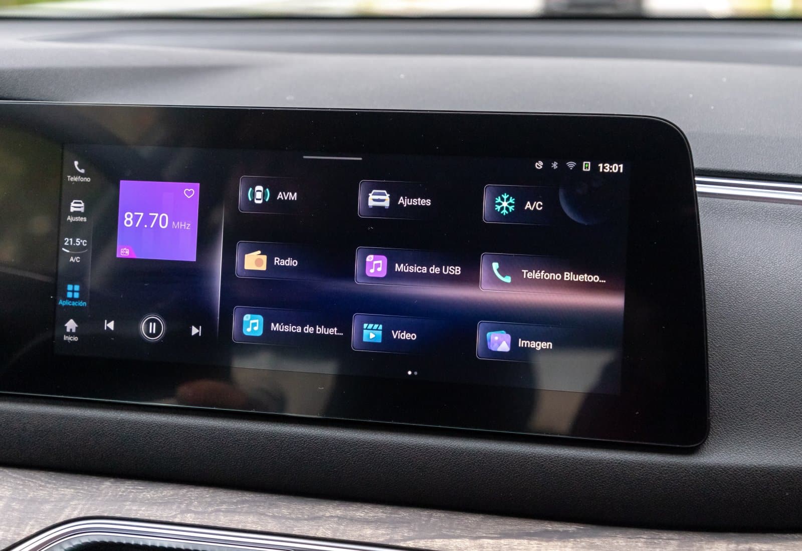 Es compatible con Android Auto y Apple CarPlay sin cables, pero no tiene actualizaciones OTA. Ofrece la posibilidad de contar con diversas apps y las imágenes de las cámaras 360º son buenas. Nos gusta que, si bien muchas funciones se manejan desde la pantalla, se han dejado fuera los controles básicos del climatizador monozona.