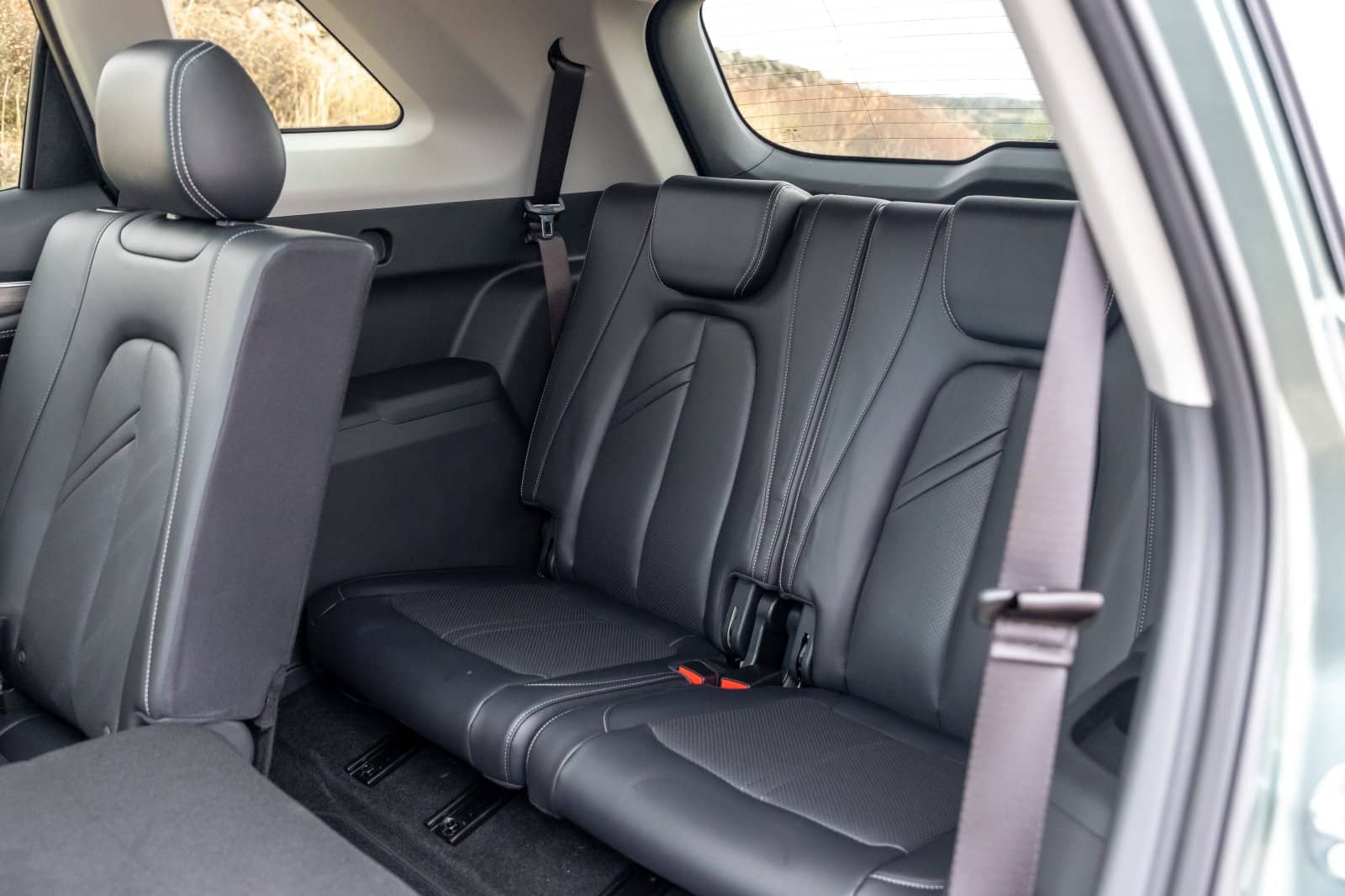 La calidad de terminación también se ha cuidado en esta fila. Vemos las molduras que imitan madera y cuero Nappa en los reposabrazos de las puertas. Con respecto a la tercera fila, su uso queda limitado a niños o adultos pequeños. El plegado de los asientos de la segunda fila y el acceso requieren agilidad y el hueco para pies y rodillas es limitado.