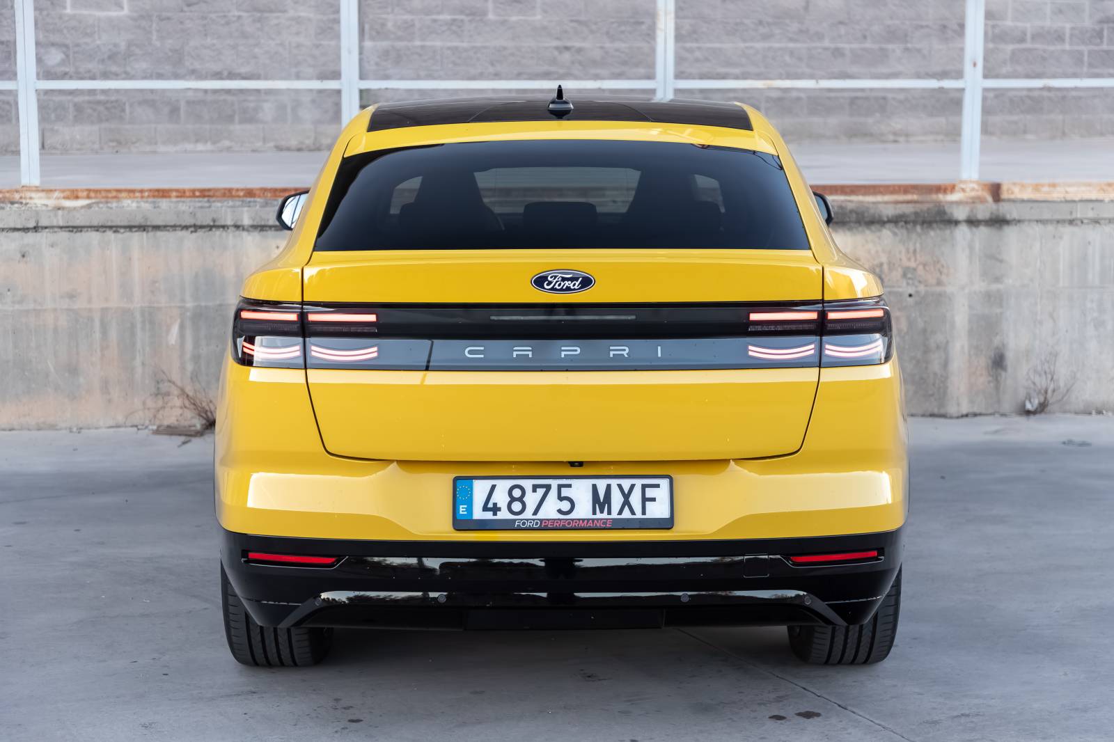 Lo que sí puedes es mejorar la luminosidad del habitáculo con el techo de cristal panorámico. Ya en la zaga, destacan las líneas horizontales que asientan al Ford Capri sobre el asfalto y los pilotos LED. Como ocurre en la parte delantera, estos van unidos por una franja negra en la que podemos leer la denominación del modelo. No hay colas de escape.