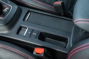 En la consola central encontramos un reposabrazos deslizable con guantera, diversos espacios portaobjetos, la palanca de cambios (o el selector giratorio) y el freno de estacionamiento eléctrico. El cargador inalámbrico de smartphone es de serie en este acabado y los cinturones de seguridad pueden regularse en altura, lo que es un punto a favor.