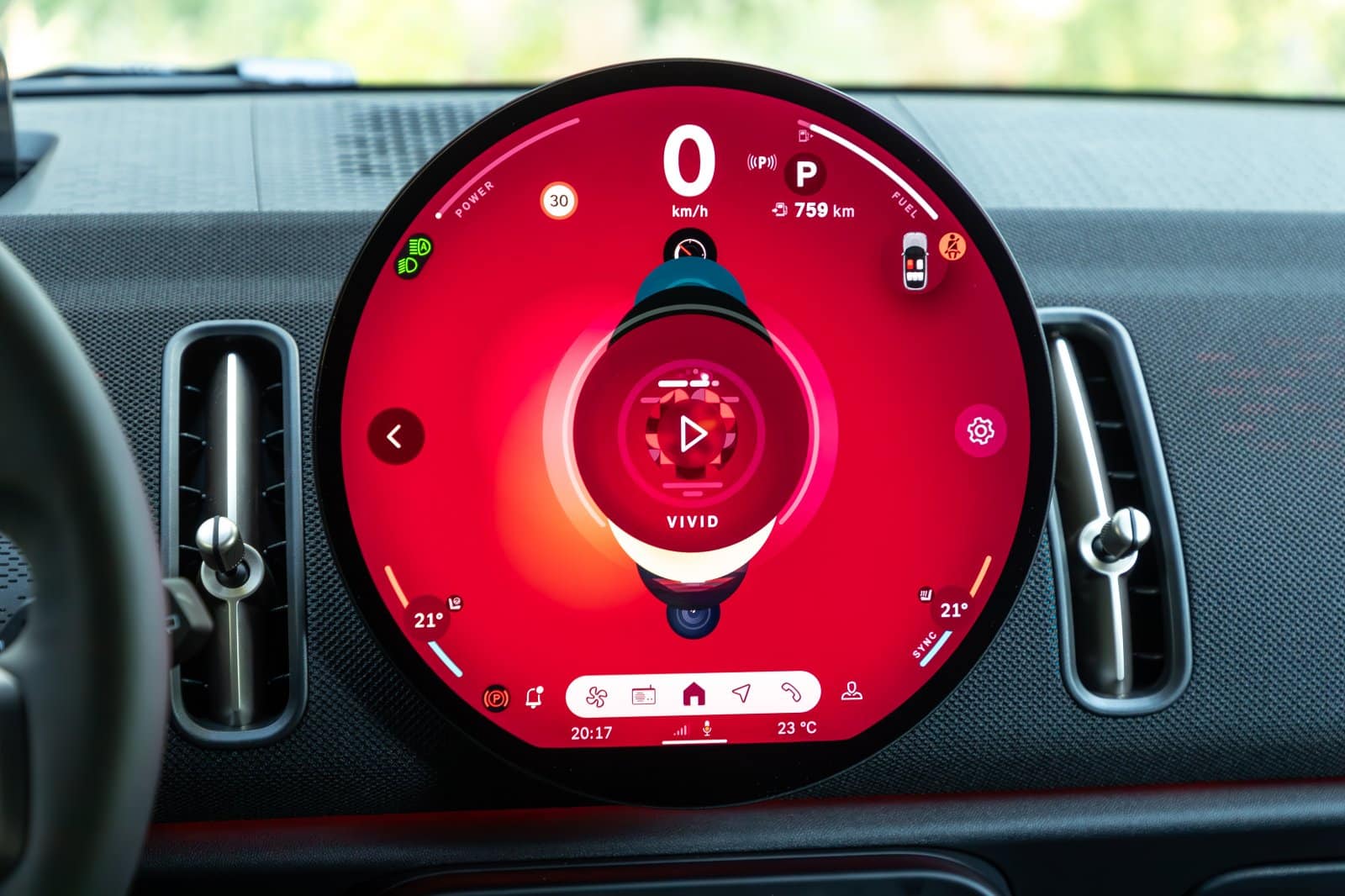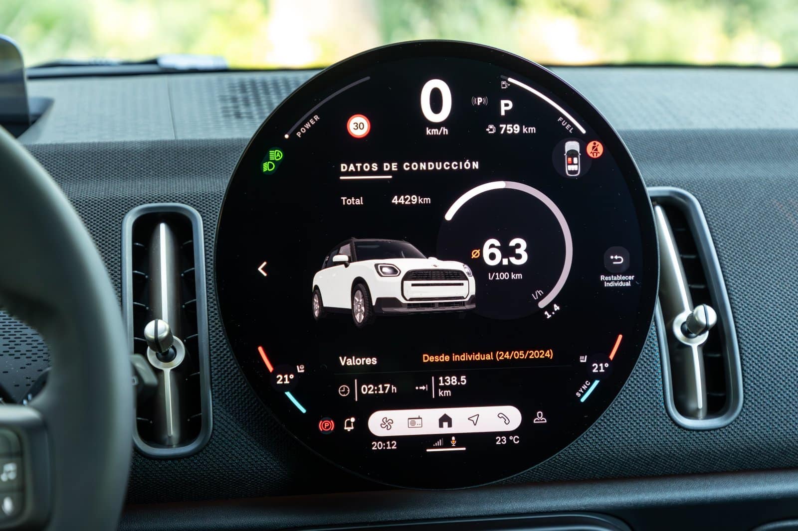 La pantalla OLED redonda, con un diámetro de 240 mm y colores intensos, se integra perfectamente en el interior de la nueva familia MINI. Su posicionamiento dentro de la cabina permite que el conductor y el pasajero delantero la utilicen de forma táctil cómodamente. Por gráficos, fluidez y manejo me parece de lo mejor del mercado.