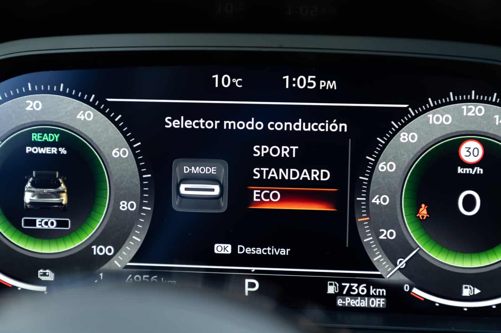 El modo Eco es el que más capa las prestaciones del coche. De hecho, hay que pisar mucho el acelerador para tener una buena respuesta. Al pisar a fondo el acelerador, las prestaciones son las mismas en todos los modos. Tampoco falta la posibilidad de elegir un mayor nivel de retención en la frenada regenerativa con la posición B del cambio.
