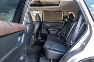 En la base de las puertas, una característica insertada aporta una sensación de fluidez a las superficies transparentes de las puertas. La forma del pilar C recuerda a una aleta de delfín, trayendo tensión a la parte trasera donde las luces envolventes completan el aspecto trasero de tres cuartos. Con respecto a las dimensiones, el X-Trail ha crecido.