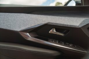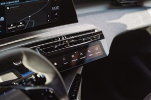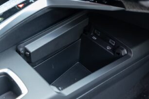 Estos se pueden programar para proporcionar acceso rápido a diez funciones. Pasando a la consola central, en ella tenemos un hueco portaobjetos que alberga la carga inalámbrica del smartphone opcional de 15W. Más abajo, con tapa, tenemos otra con las tomas USB-C y 12V. Le siguen dos posavasos y un reposabrazos fijo. Bajo este, hay una guantera.