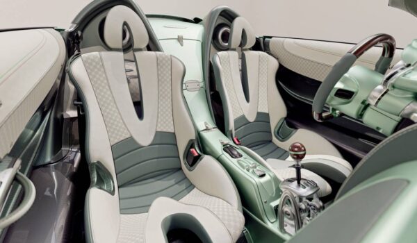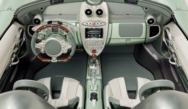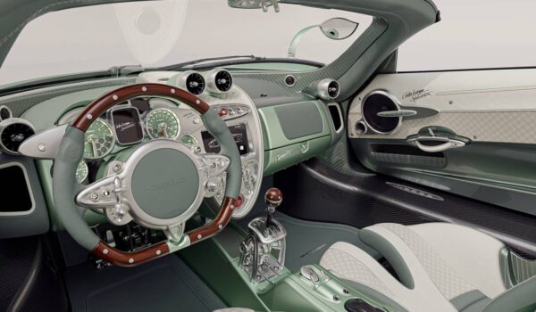 Los cueros martillados y cosidos a mano, los metales mecanizados y una tela bordada exclusiva —inspirada en el icónico diseño de los cuatro escapes de Pagani— revisten el interior con más de 450.000 puntadas hechas a mano.