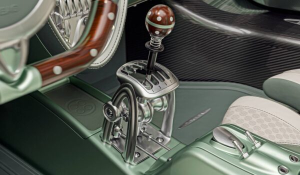 El volante y la palanca de cambios evocan las de los clásicos de competición, con inserciones en madera y fibra de carbono, y detalles en aluminio remachado a mano, en un guiño contemporáneo al legendario estilo Nardi.