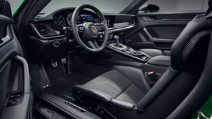 Las salidas del sistema del escape deportivo son de color negro brillante. Los clientes que busquen aún más personalización pueden elegir el pack interior Carrera T opcional. Se compone de cinturones de seguridad con color de contraste Gris Pizarra o Verde Lizard, el mismo tono que el de las costuras decorativas, el logotipo del 911 en relieve en los reposacabezas y los asientos con una franja central. Como opción, las alfombrillas también pueden llevar el logotipo y las costuras en esos dos colores de contraste.