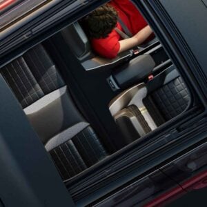 El techo de lona negra le da al Renault 4 un aspecto fresco y diferente. Las barras del techo desaparecen para maximizar la apertura, y la antena se integra en la luneta trasera. Renault colaboró con especialistas como Webasto y Haartz para conseguir un excelente aislamiento acústico y hermeticidad, usando materiales ligeros (plástico en lugar de metal y solo tres pliegues en la tela). El resultado es menos peso, mayor eficiencia y menos ruido, tanto con el techo cerrado como abierto (gracias a un deflector automático).