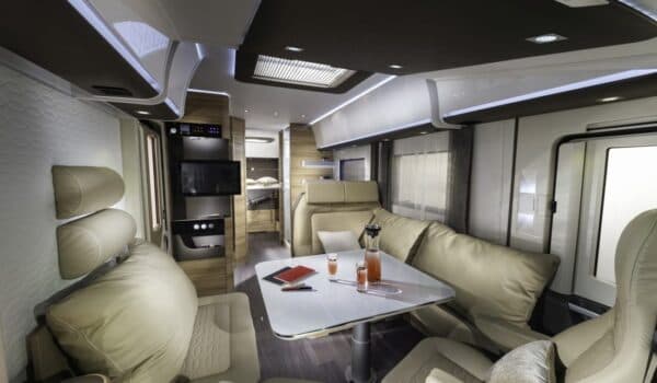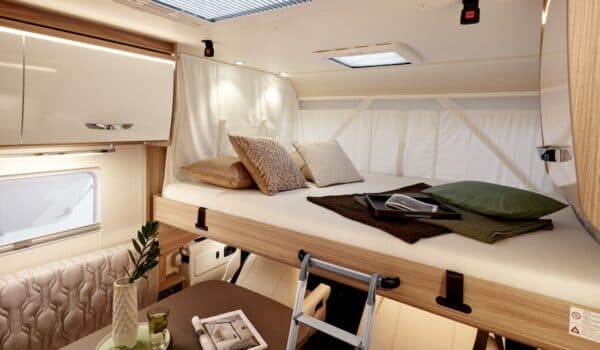 Lo normal es que este tipo de autocaravanas incluyan un salón cómodo y bien presentado. Esconde en el techo una cama abatible para dos personas. Este sistema suele ser eléctrico, aunque hay opciones más económicas con accionamiento manual. Lo más negativo de este tipo de autocaravanas es que anula el salón cuando está la cama bajada, y por tanto se pierde versatilidad.
