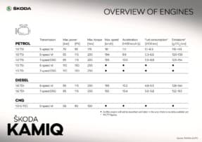 La gama inicial del Skoda Kamiq está formada por los bloques de gasolina 1.0 TSI de 95 y 115 CV, y el 1.5 TSI EVO de 150 CV. Los tres van asociados a una caja manual pero los dos más potentes pueden añadir la DSG. En diésel está disponible el 1.6 TDI con 115 CV con las dos transmisiones citadas.