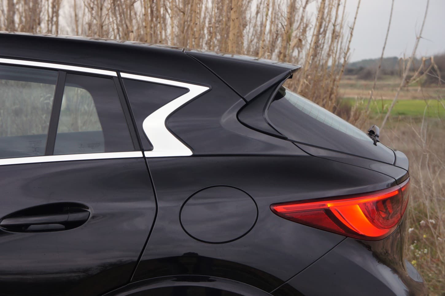 Independientemente del nivel de terminación elegido, incluyen molduras cromadas con efecto “frío” de calidad, muchos detalles pintados en negro brillante para evitar que el plástico haga acto de presencia como tal y las luces diurnas por LEDS cuentan con un dibujo muy personal. Como buen “premium” deja en opción algunos elementos que deberían ser de serie pero si nadie se queja en Audi, BMW o Mercedes, no veo motivo para que en Infiniti sí. Esto lo digo por la ausencia de llantas de aleación o antinieblas de serie en el modelo base.
