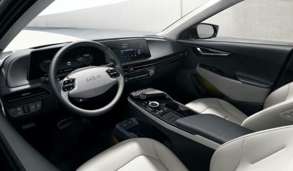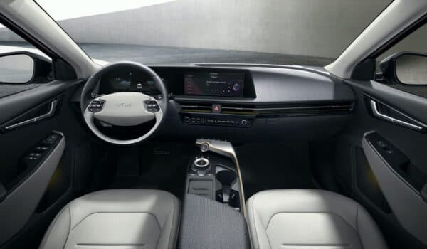 El interior también es muy distinto al del resto de la gama Kia actual e incluye una pantalla curva que abarca tanto el grupo de instrumentos totalmente digital como la pantalla del sistema de infoentretenimiento. El EV6 luce un sencillo volante de dos radios similar al de los nuevos modelos Genesis, como el GV80.