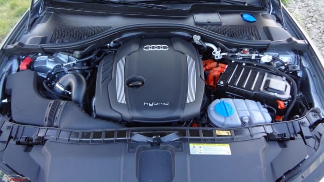 Se trata de un eficiente sistema híbrido paralelo: su motor de combustión, un 2.0 TFSI con 211 CV (155 KW) de potencia y 350 Nm de par, colabora con un motor eléctrico que rinde 45 CV (33 KW) y 211 Nm de par. El motor eléctrico se encuentra justo detrás del TFSI, ocupando el espacio del convertidor de par delante del tiptronic de ocho velocidades modificado. La caja de cambios traslada el par de los motores a las ruedas delanteras.