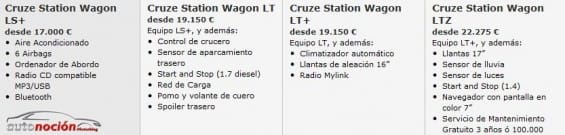 La unidad de pruebas montaba el acabado LTZ (el más alto). A este acabado tan solo le podríamos añadir como extra unas llantas con diferente acabado, pintura metalizada, piel y unos cuantos accesorios por lo que podemos decir que si te decides por un Cruze SW con el acabado LTZ te estarás llevado un vehículo bien equipado.
