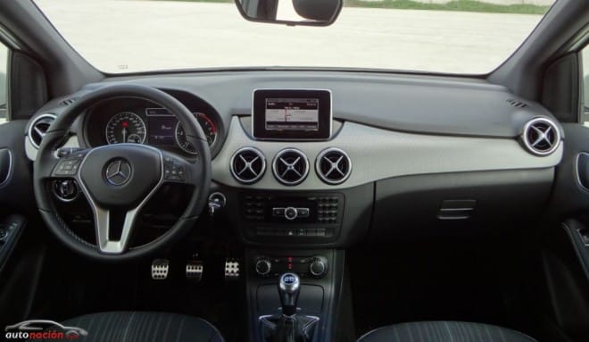 Unos materiales de alta calidad y superficies depuradas y elegantes hacen que la nueva Clase B sea un punto de referencia en el segmento de los familiares compactos. El salpicadero de materiales acolchados es una verdadera maravilla. Lejos de juzgar el diseño (que puede gustar más o menos), los acabados generales del interior son muy buenos. El salpicadero cuenta con una superficie mate resistente a la suciedad que da una agradable sensación de calidad. En la parte central del salpicadero, encontramos un acabado deportivo en símil aluminio que traslada la deportividad exterior al interior. Las tres grandes aberturas redondas en el centro y laterales y sus boquillas en forma de “X” añaden un atributo deportivo y de estilo al interior. En la parte media del salpicadero encontramos el equipo de música, con manos libres y entradas AUX y USB. Más abajo encontraremos el aire acondicionado manual. (Justo encima encontraremos el botón ECO) La pantalla está disponible en dos tamaños, con una diagonal o 147 o 178 milímetros. Esta, parece flotar sobre las rejillas de ventilación. Con su diseño elegante y las líneas delgadas, la pantalla a color (TFT) es un escaparate muy atractivo en la cabina de la nueva Clase B. Los menús de la pantalla funcionan por medio de pulsadores giratorios ubicados en la consola central. La navegación del sistema se puede hacer desde una botonera ubicada tras la palanca de cambios.