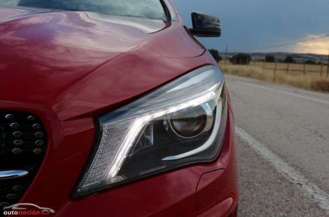 Su agresivo frontal destaca por su parrilla y su capó en forma de “V”. En la zona central de la parrilla de efecto diamante con pasadores plateados encontramos la gran estrella de la marca. A los extremos encontramos los faros que acentúan aún más las líneas del capó gracias a los módulos de luz diurna LED que dentro del módulo principal del faro de Xenón, son como unas “cejas enfadadas”. Lo mismo podemos decir de los intermitentes que también están fabricados en la tecnología de diodos luminosos. Nuestra unidad venía equipada el “AMG Line” en el que predomina el color rojo, y los detalles en este color inundan el vehículo tanto por dentro como por fuera. En el caso de los faros encontramos unos anillos en color rojo que rodean los proyectores de Xenón.
