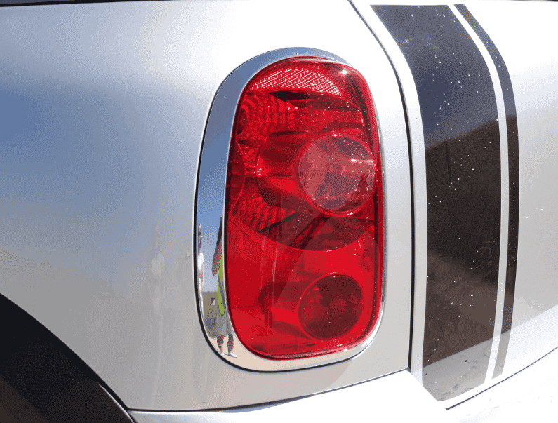 La musculosa línea de la cintura acentúa adicionalmente el aspecto masculino del vehículo. El techo con deflector aerodinámico integrado, sobresale de la superficie de la luneta. Una esbelta cinta embellecedora cromada de trazado horizontal circunda todo el vehículo, marca una delimitación adicional entre la carrocería y la superficie acristalada. Al igual que en todos los Mini, también los pilotos posteriores del Mini Countryman tienen un diseño vertical, por lo que contrastan con la prevalencia de las líneas horizontales en la zaga. Estos pilotos están enmarcados con un embellecedor cromado y sobresalen tridimensionalmente de la superficie de la carrocería.