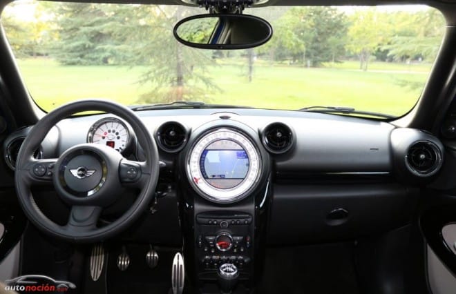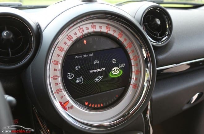 Esta gran esfera contiene el velocímetro, el medidor de combustible y un pequeño cuadro con testigos. Nuestra unidad montaba el sistema de Radio navegación (MINI navigaton System) que incluía una pantalla que se operaba desde un sistema idrive ubicado en el guarnecido del túnel de transmisión.