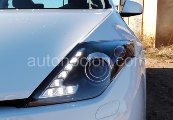 Su atractivo frontal no difiere mucho del de un Laguna convencional salvo por la parrilla con acabado cromado que ocupa la parte inferior del paragolpes. Justo encima encontramos el aerodinámico capó con un abombamiento que nace de la insignia de la marca. A ambos lados del capó nos topamos con los increíbles faros Bi-Xenón con los que venía equipada nuestra unidad de pruebas y que poseen iluminación diurna LED. Esta misma iluminación otorga un aspecto distinguido al vehículo durante el día y especialmente durante la noche. Lo primero que nos viene a la mente es la ausencia de luces antiniebla en la parte inferior del frontal del vehículo. Echo en falta sensores de aparcamiento de serie en la parte delantera ya que hablamos de un vehículo que la marca enmarca en el segmento Premium y dado su prolongado capó carecemos de referencias claras durante el estacionamiento (es posible su montaje en acabados superiores).