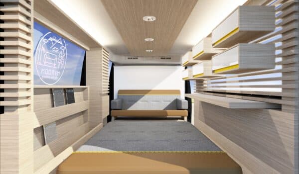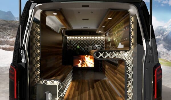 El detalle más curioso es la chimenea digital que aporta un toque hogareño al conjunto. Junto al Mountain Base estará el Caravan Myroom Concept, cuyo habitáculo es aún más acogedor. Los exteriores son similares en cuanto a materiales, pero en el interior un gran colchón central es el protagonista. En el fondo vemos un sofá y hay un estante para libros, una mesa y armarios.