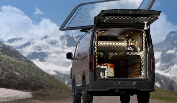 Para disfrutar de electricidad durante las aventuras, un panel solar desplegable descansa sobre el techo. Ponen la guinda del pastel las llantas beadlock negras con neumáticos todoterreno. En el interior, el suelo y las paredes tienen paneles de madera. Un lado del interior tiene una mesa de trabajo y en el lado opuesto encontramos un banco.