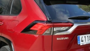 En el frontal nos encontramos con el logo de Suzuki en posición central, justo en una estrecha entrada de aire horizontal que sirve como conexión entre los rasgados faros LED específicos del modelo con lavafaros. En una posición inferior nos encontramos con una gran entrada de aire con estructura de panal de abeja rematada en negro brillante que además de lucir el portaplacas, nos oculta parcialmente la batería de sensores de aparcamiento delanteros que el modelo equipa de serie -recuerda que Suzuki solo trae el Across en el acabado «tope de gama», dejando a Toyota la posibilidad de ofrecer acabados inferiores y de menor precio-.