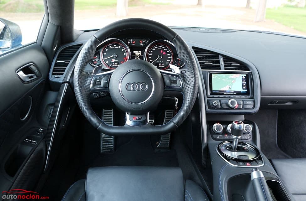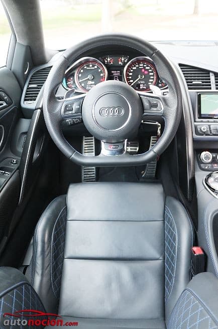 Todo está al alcance de las manos y a la vista del conductor. Las manos se posan cómodamente sobre un sólido volante tapizado en cuero perforado con ribetes en contraste azul que monta en la parte inferior el logo R8, justo encima de la zona ligeramente achatada. El volante incorpora dos botones y dos scrolls así como unas levas solidarias de aluminio que convierten los cambios de marcha en una auténtica gozada. Tras el volante nos encontramos con el panel de instrumentos clásico de los modelos Audi de la anterior generación en los que destaca el FIS central que en este modelo cuenta con laptimer así como con funciones únicas de los R8.