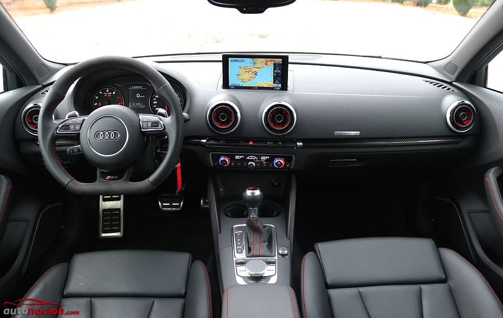 El interior del nuevo Audi RS 3 Sportback está acabado en negro y lo que más destaca son los asientos deportivos tapizados en piel Nappa Fina con costuras de color rojo en forma de rombos y el emblema RS 3 en el reposacabezas. Los pedales y reposapiés son de acero inoxidable, y los paneles de puerta llevan franjas de Alcantara. Como es habitual en los modelos RS, los embellecedores de fibra de carbono de nuestra unidad de prueba eran opcionales. Los relojes de la instrumentación RS son negros, las agujas rojas y las graduaciones blancas. Biseles en negro antracita brillante enmarcan los diales.