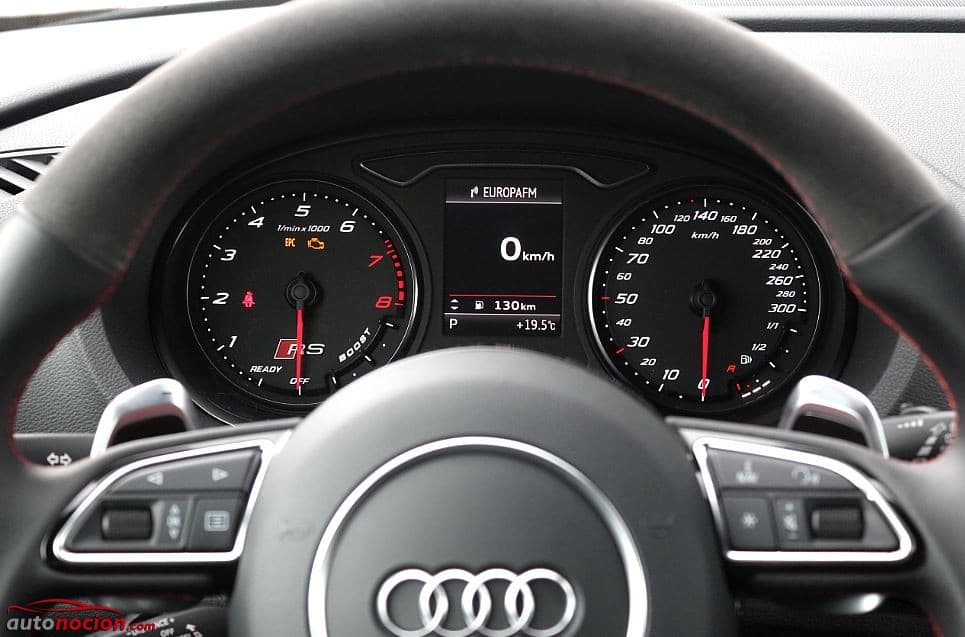 En nuestra unidad, disponíamos de un deportivo volante multifunción de tres radios al que le venían como anillo al dedo las deportivas y generosas levas de aluminio que nos permitían exprimir cómodamente las prestaciones del modelo. Adicionalmente, el volante cuenta con la corona achatada, está revestido en cuero y Alcántara y adicionalmente monta el emblema RS 3 en la parte superior, justo donde cuenta con un ligero achatamiento.Los dos grandes instrumentos redondos se pueden leer de forma rápida y fiable, y entre ellos se encuentra el display de 3,5 pulgadas del sistema de información al conductor (FIS) que ofrece informaciones de consumo medio, velocidad digital, parciales, kilometraje total, medidor de eficiencia, Lap Timer, Temperatura de aceite, etc… El sistema de información al conductor incluye un manómetro de sobrealimentación, un termómetro de aceite y un cronómetro.