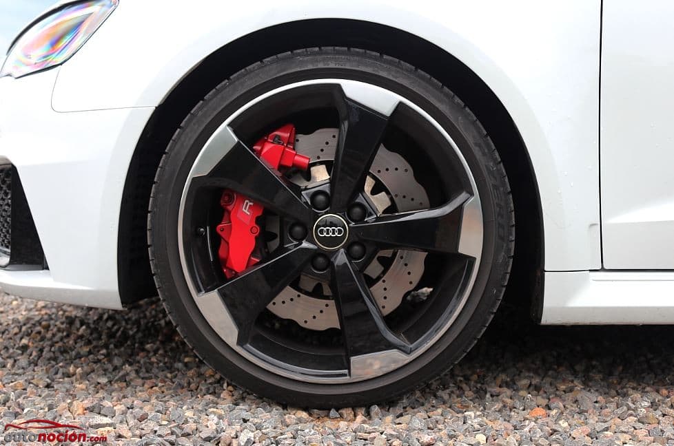 Visto de perfil, este modelo cuenta con el ya clásico diseño Sportback que además de darle un inconfundible toque al modelo, lo dota de una mayor polivalencia. Su corte medio deportivo queda resaltado por unos abultados y abombados pasos de rueda que en nuestra unidad albergaban unas impresionantes llantas de aleación opcionales en diseño de cinco brazos dobles y acabado en dos tonos que montaban unos recomendables neumáticos Pirelli P ZERO en dimensiones 235/35 R19 91Y. Estas llantas suponían un sobrecoste de 890 euros. Las llantas de aleación ocultan unos discos de freno ventilados internamente que miden 370 mm de diámetro delante y 310 atrás. En el eje delantero llevan un diseño ondulado wave y están perforados para una máxima disipación térmica. Están conectadas por pernos al núcleo de freno, realizado en aluminio, y las pinzas son de ocho pistones pintadas en rojo con logos RS.