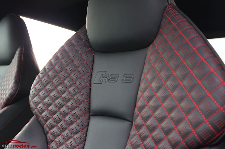 Los asientos deportivos proporcionan una sujeción y un apoyo óptimos. Los cojines de los mismos se pueden extender, y los respaldos incorporan la inscripción RS 3 grabada. Nuestra unidad montaba los asientos deportivos S delanteros de nuevo desarrollo con airbag laterales integrados. Además de una imponente estética, estos asientos suponen un sobrecoste de 945 euros.