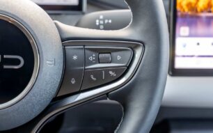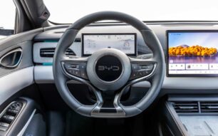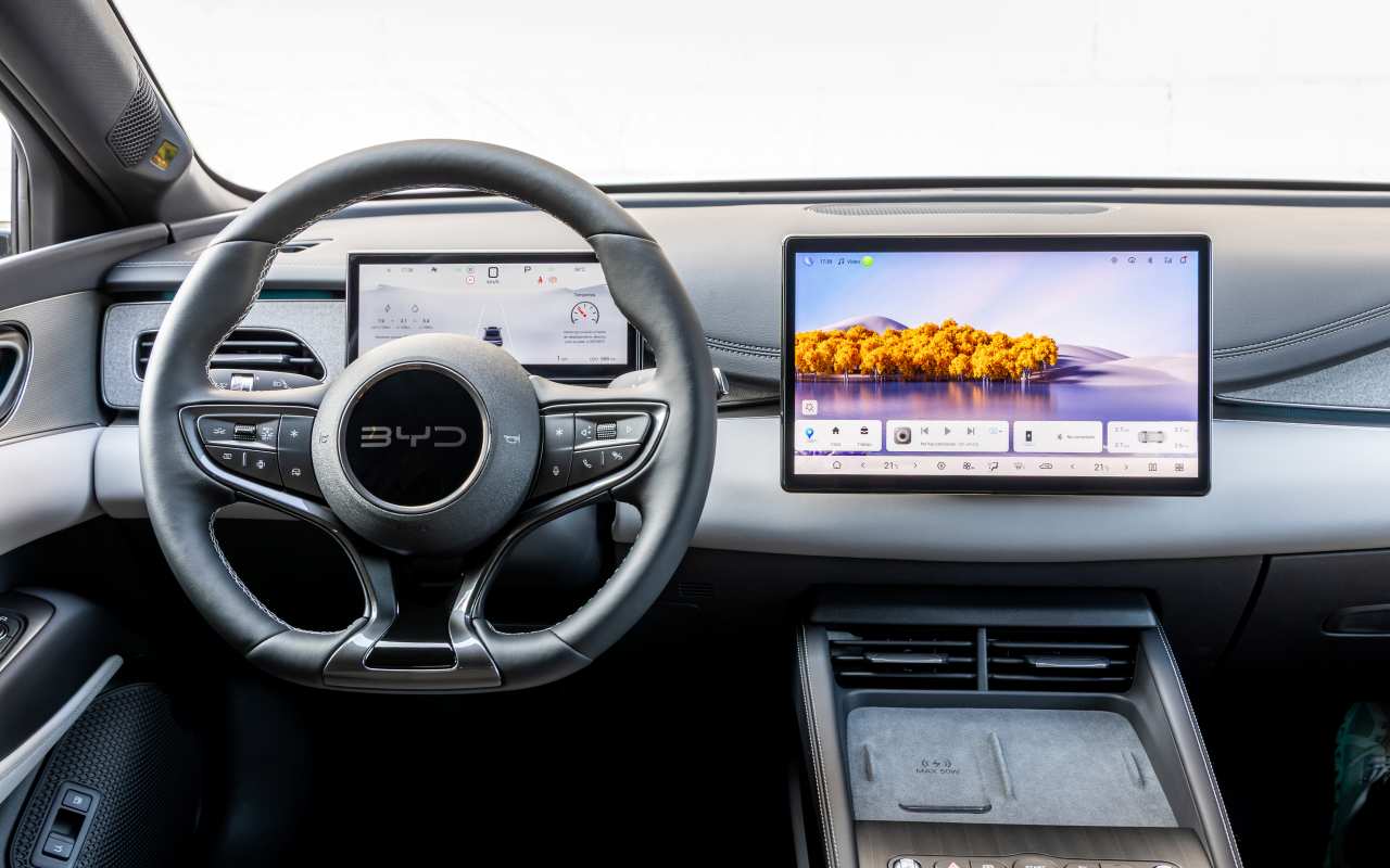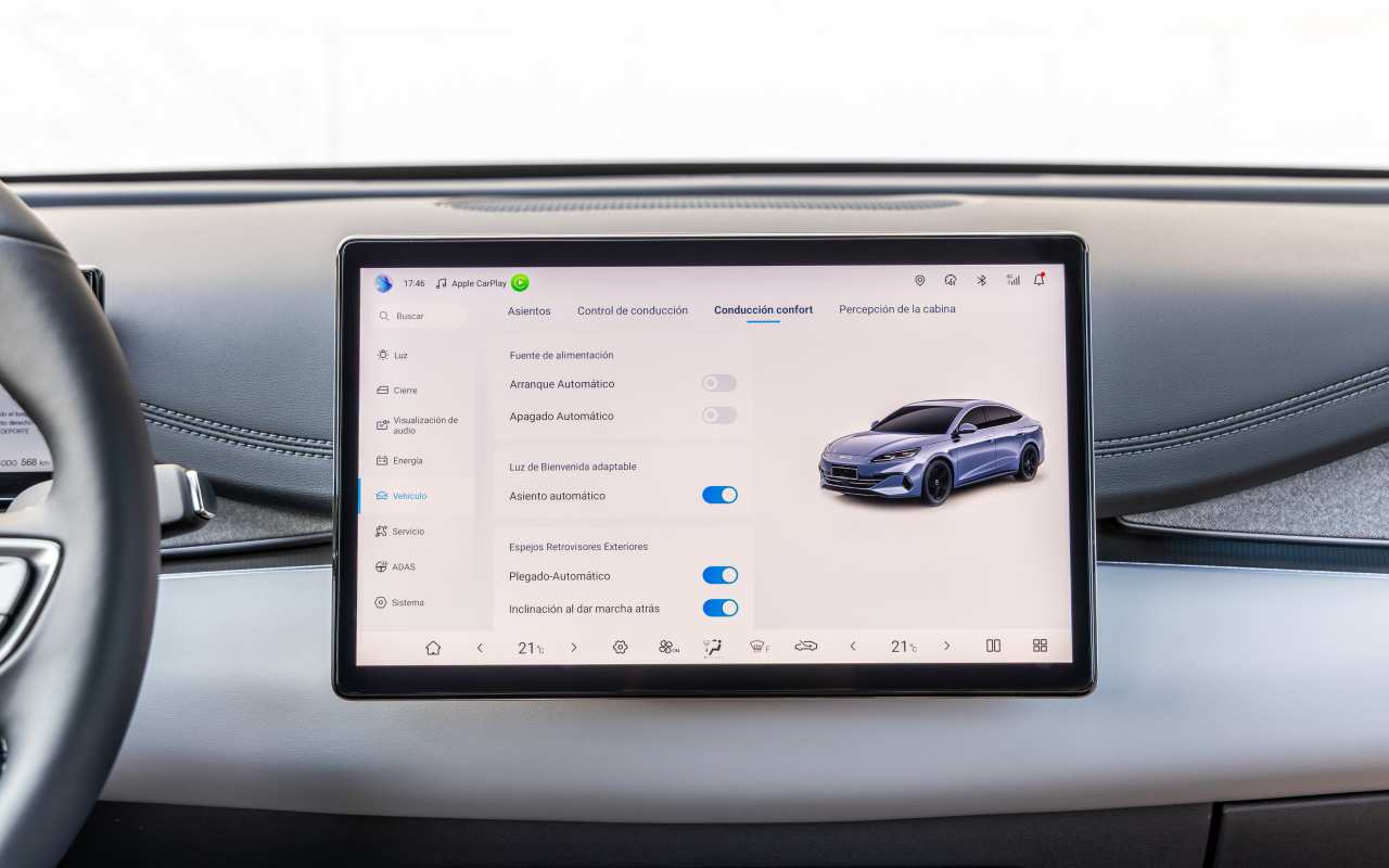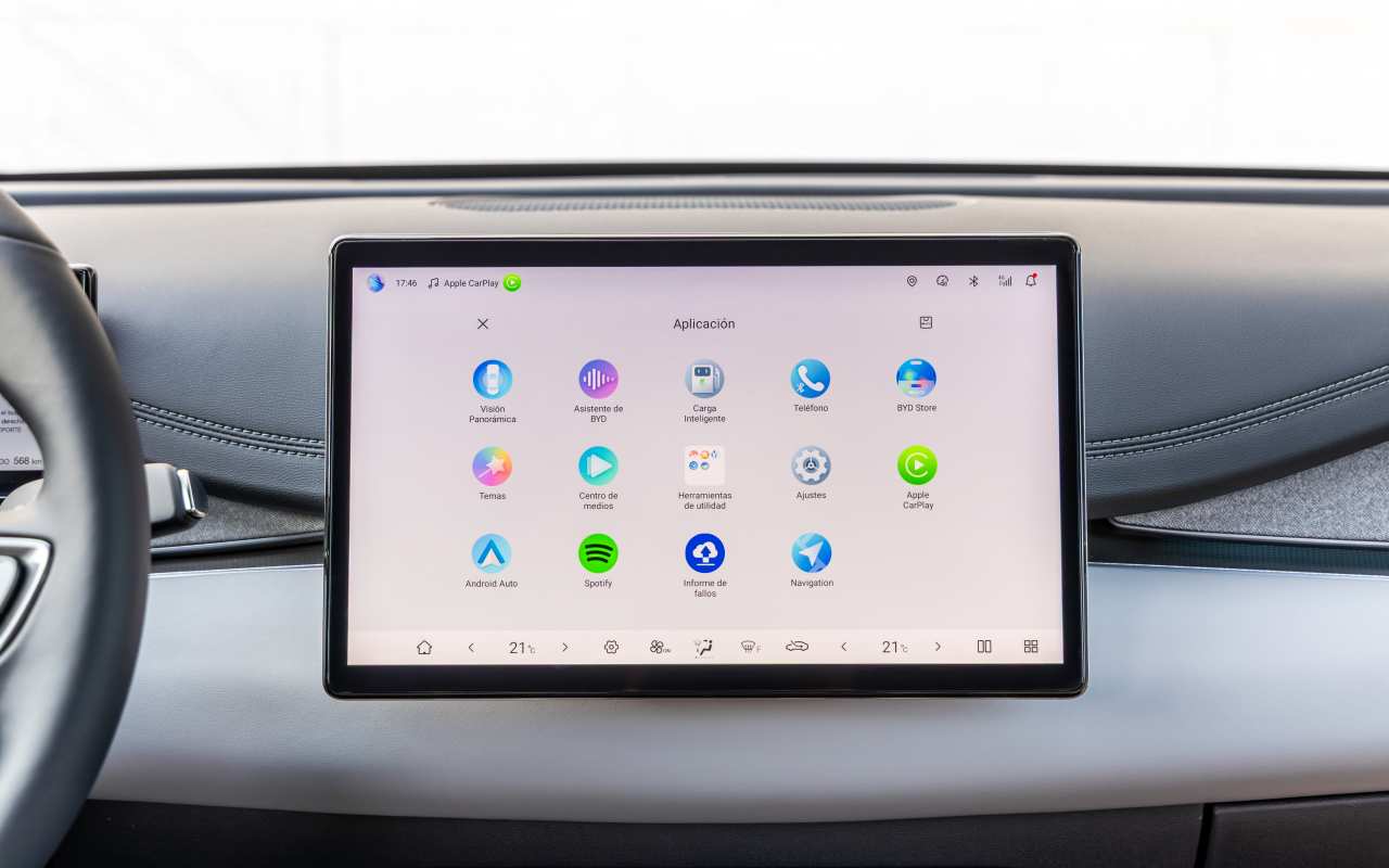 Preside el interior la icónica pantalla giratoria BYD de 12,8” o 15,6 pulgadas según versión, compatible con Android Auto y Apple CarPlay. Su alta resolución y fluidez la sitúan entre las mejores del segmento. La instrumentación digital de 8,8 pulgadas y los mandos minimalistas refuerzan la sensación tecnológica. La iluminación ambiental y los acabados en tela refuerzan la sensación de calidad. Esta calidad se pierde se difumina en elementos como los tiradores interiores de las puertas, que parecen muy ligeros y endebles. El volante tiene un buen tacto pero el uso de materiales plásticos brillantes en la parte central e inferior le hacen perder calidad percibida.