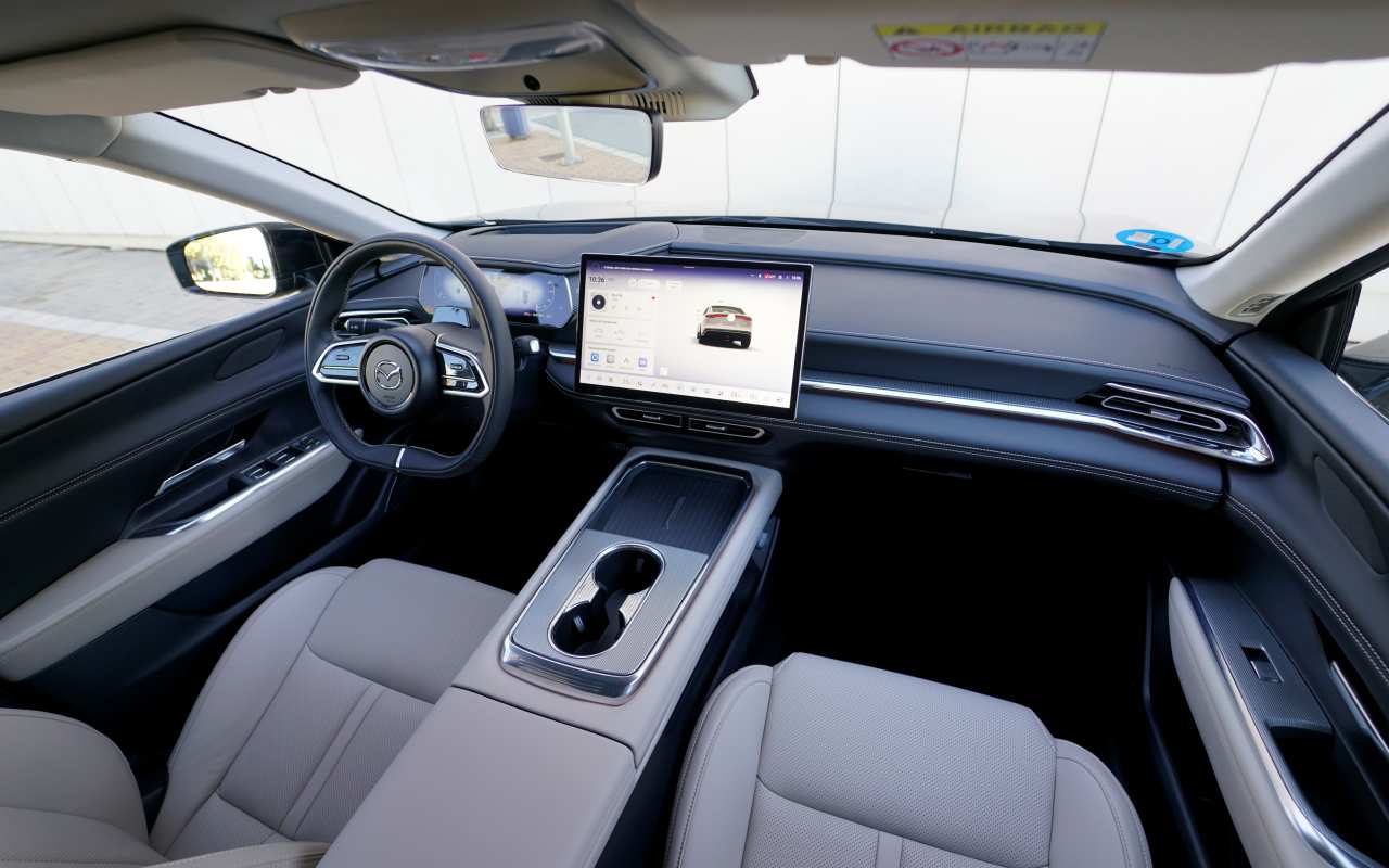 Si el exterior sorprende por su equilibrio, el interior del Mazda6e conquista por su refinamiento. Mazda ha conseguido un ambiente cálido, tecnológico y sereno al mismo tiempo. No hay estridencias ni pantallas desproporcionadas: todo está orientado al conductor, pero sin sacrificar la comodidad de los acompañantes.