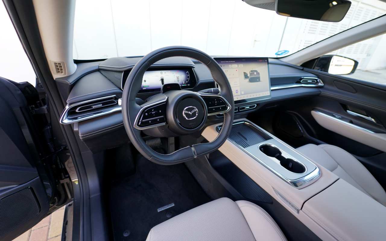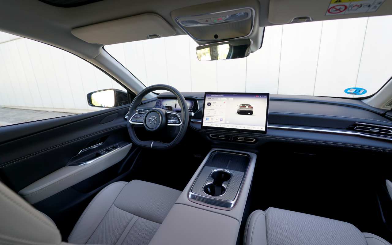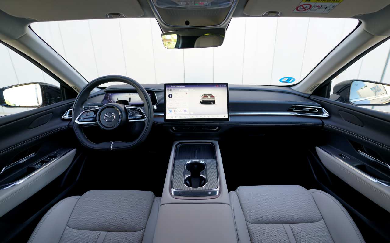 La sensación de calidad es uno de los grandes puntos fuertes del coche. Las superficies blandas, el cuero de tacto espeso y la solidez de los mandos recuerdan al Mazda CX-60, aunque con un diseño más envolvente. En el acabado Takumi Plus, la tapicería de cuero Nappa y el techo panorámico aportan un aire de lujo que muchos competidores solo ofrecen a precios mucho más elevados.