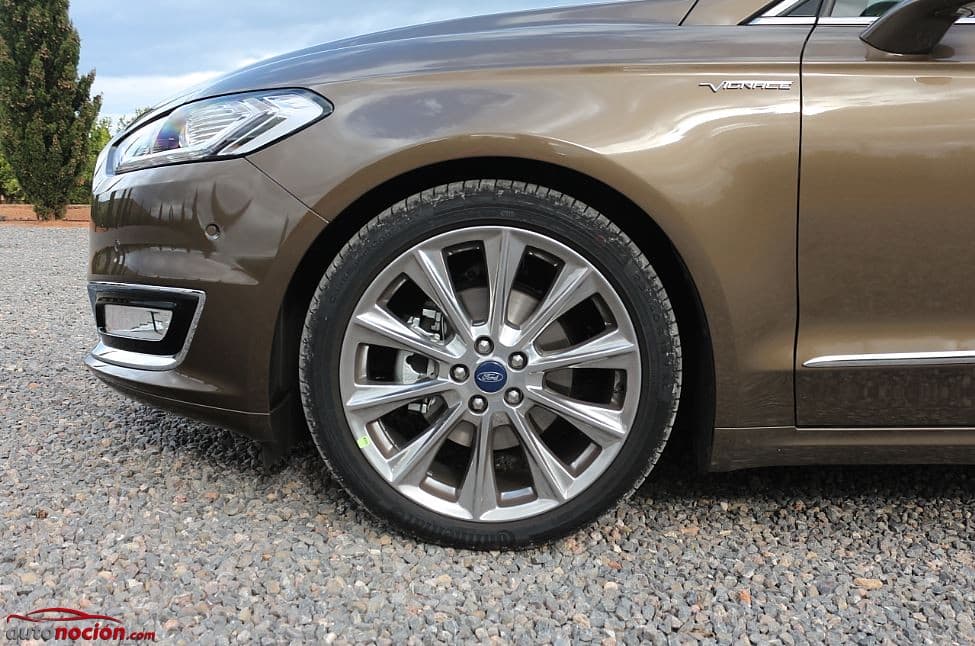 La vista lateral del Mondeo cuenta con unas líneas limpias y muy fluidas. Hay que destacar los abultados pasos de rueda en los que nuestra unidad de pruebas equipaba unas impresionantes llantas de aleación Vignale de diez radios que montaban unos neumáticos Continental ContiSportContact5 en dimensiones 235/40 R19 96Y XL–estas llantas suponen un sobrecoste de 1000 euros respecto a las de serie-.