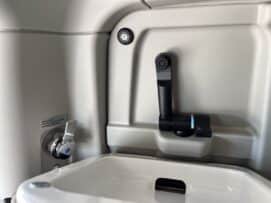 La principal ventaja del Ford Nugget Plus respecto a los Nugget convencionales y los rivales más arriba mencionados está en que se incluye un práctico WC y un lavabo abatible. Por supuesto hay ducha exterior con agua caliente y en el mercado hay muchos accesorios para poder ducharse dentro sin encharcarlo todo. Para tener un poco más de intimidad en el WC hay una curiosa mampara retráctil.