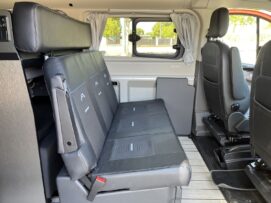Lo más interesante de la Ford Nugget Plus está en la zona habilitada como vivienda. Cuenta con una distribución muy interesante que permite presumir de un pequeño salón para cinco personas (girando los asientos delanteros) y una zona trasera en la que se esconden la cocina, nevera, armarios y el baño… sí, hay baño.