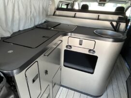 Como puedes ver lleva muchas cosas y otras tantas que no se han incluido pero que son muy prácticas como una mesa integrada en el portón posterior, otra mesa para el habitáculo, dos sillas plegables, gran cajón porta-objetos tras la banqueta trasera, asientos delanteros giratorios, toldo exterior e incluso hasta un útil paraguas.